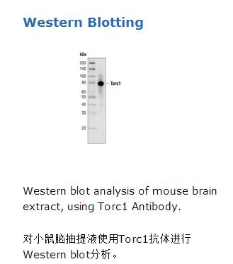 Torc1抗体识别内源性的Torc1总蛋白水平,并且不与Torc2和Torc3发生交互作用。该多克隆抗体用与人类Torc1蛋白(G296周围)氨基酸序列对应的人工合成肽段免疫动物而制成。该抗体使用蛋白A和蛋白亲和层析纯化制得。