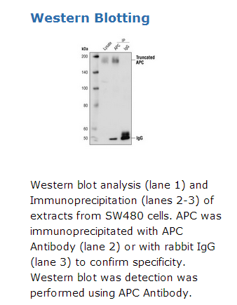 Polyclonal antibodies are produced by immunizing animals with a synthetic peptide corresponding to the sequence of human APC. Antibodies are purified by protein A and peptide affinity chromatography.