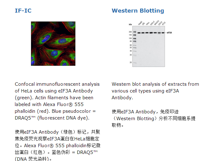 Polyclonal antibodies are produced by immunizing animals with a synthetic peptide corresponding to a sequence of human eIF3A. Antibodies are purified by peptide affinity chromatography.