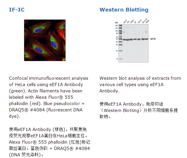 eEF1A Antibody检测内源性eEF1A总蛋白水平。通过人工合成人源eEF1A蛋白羧基末端相应序列的多肽片段,使用该片段去免疫动物从而制备多克隆抗体。通过蛋白A和多肽亲和层析纯化抗体。翻译是氨基酸在核糖体上装配成多肽的过程。这个过程通常分为翻译的起始、延伸和终止三个阶段。在延伸过程中,mRNA和tRNA在核糖体的两个活化位点(A and P sites)配对。在哺乳动物细胞系中,许多真核延伸因子(eukaryotic elongation factors,eEFs)涉及到这个延伸过程(1)。eEF1A又称延伸因子Tu (EF-Tu)结合GTP并且和氨基酰- tRNAs相互作用,从而促进氨基酰- tRNAs招募到核糖体的A位点(1)。在GTP水解之后,GDP-eEF1A离开核糖体,并且通过eEF1B将其转变成GTP-eEF1A (1)。研究证明eEF1A蛋白在一定的条件下被磷酸化,显示该蛋白的活性是在翻译后水平被调控的(2,3)。