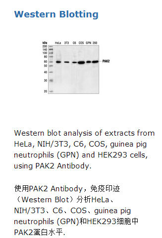 PAK2 Antibody detects endogenous levels of total PAK2 protein. This antibody does not cross-react with PAK1, PAK3 or PAK4-6.