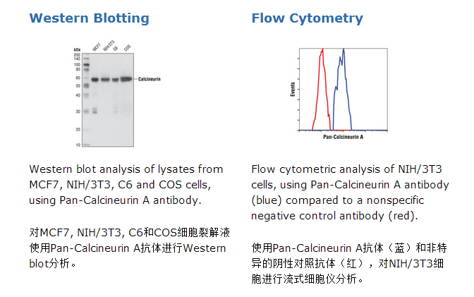 Polyclonal antibodies are produced by immunizing animals with a synthetic peptide corresponding to the carboxy-terminus of human Calcineurin A (alpha isoform). Antibodies are purified by protein A and peptide affinity chromatography.