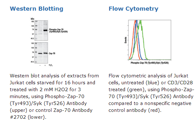 Phospho-Zap-70 (Tyr493) Antibody detects endogenous levels of Zap-70 only when phosphorylated at Tyr493.