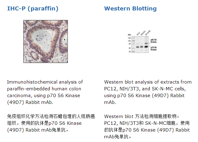 p70 S6 Kinase (49D7) Rabbit mAb兔单抗检测内源性的p70 S6激酶总蛋白。也识别p85 S6激酶。该单克隆抗体是由合成的人源的针对p70 S6激酶氨基端序列的肽段免疫动物而生产的。p70 S6激酶是有丝分裂原活化的丝氨酸/苏氨酸蛋白激酶,是细胞生长和G1期细胞周期正常进行必需的(1,2)。P70 S6激酶可以磷酸化核糖体40S亚基的S6蛋白并参与5‘ oligopyrimidine tract mRNAs的翻译控制(1)。另一个亚型,P85 S6激酶,和p70 S6激酶由相同的基因转录,但氨基端有23个额外的残基,编码核定位信号(1)。两种亚型都处于有丝分裂原激活的PI-3K和rapamycin靶点FRAP/mTOR的信号通路下游,这条通路独立于Ras /MAP激酶级联反应(1)。p70 S6激酶活性取决于在催化、连接和伪底物结构域的多种磷酸化修饰(1)。催化结构域的Thr229和连接结构域的Thr389是调节激酶功能最关键的磷酸化修饰位点(1)。而且与P70激酶体内活性最相关的磷酸化修饰位点是Thr389(3)。Thr389磷酸化可以激活PDK1的Thr229磷酸化(4,5)。这个位点的磷酸化受到各种生长因子,如胰岛素,表皮生长因子和成纤维细胞生长因子,以及血清和一些G蛋白偶联受体配体,wortmannin,LY294002(PI-3K抑制剂)和rapamycin(FRAP/mTOR抑制剂)的刺激(1,6,7)。Ser411,Thr421和Thr424位于伪底物结构域的丝氨酸脯氨酸丰富区(1)。这些位点的磷酸化被认为是通过解除伪底物的抑制进而激活p70 S6激酶(1,2)。另一个对LY294002和rapamycin敏感的磷酸化位点,Ser371,是mTOR的体的底物,与某种抗rapamycin的P70 S6激酶突变体有关(8)。