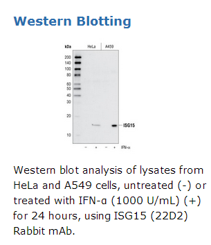 此抗体是通过合成与人ISG15蛋白氨基末端邻近氨基酸残基序列的肽段,肽段免疫动物获得。 Western blot analysis of lysates from HeLa and A549 cells, untreated (-) or treated with IFN-α (1000 U/mL) (+) for 24 hours, using ISG15 (22D2) Rabbit mAb. 使用ISG15(22D2)兔单克隆抗体在经(+)或未经(-)α-干扰素(1000 U / ml)24小时处理的HeLa和A549细胞裂解物中检测该蛋白表达的Western blot结果。