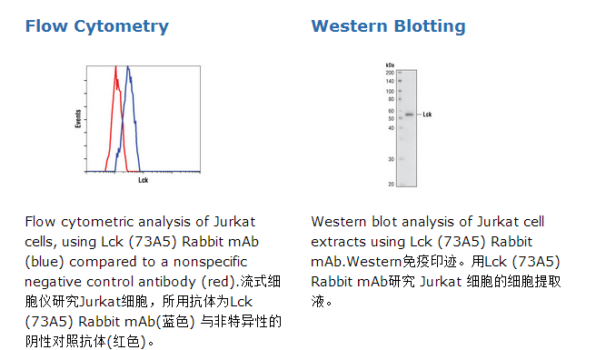 Lck (73A5) Rabbit mAb 兔单抗能够检测内源Lck蛋白总体水平。此单克隆抗体是通过合成人源对应的Lck Tyr505位点周围的肽段来免疫动物而获得。Src酪氨酸激酶蛋白家族包括Src, Lyn, Fyn, Yes, Lck, Blk 和 Hck, 其对真核细胞的生长和分化过程中起了重要的作用(1)。Src的活性是通过两个位点酪氨酸的磷酸化进行调节的, 但是具有相反地作用。在激酶活性环内的Tyr416 位点的磷酸化增加酶的活性,通过Csk磷酸化C-末端的Tyr527位点降低酶的活性(2)。p56lck (淋巴细胞激酶) 在胸腺细胞的成熟和激活以及外周血淋巴细胞的增殖过程中是一个关键的酶。p56lck的序列与 致癌基因 p60c-src的序列高度同源,正如其外显子-内含子的组织方式。p56lck并不参与到淋巴组织增生性疾病中,不管是过表达还是活性突变体。然而, 据报道在一些癌变的组织中如(结肠癌,肺癌和乳腺癌),它的表达是异常的。有报道暗示着p56lck 可能是更倾向于转移失去粘连作用的细胞(3)。