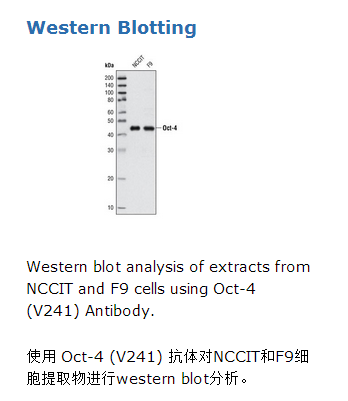 Oct-4 (V241)抗体识别内源性的总Oct-4 蛋白.多克隆抗体是通过合成的肽段免疫动物产生。这种合成的肽段与邻近人源Oct-4蛋白的Val241氨基酸残基序列一致。抗体由肽段亲和层析技术纯化.Oct-4 (POU5F1)是一类高表达于未分化胚胎干细胞和原始胚胎生殖细胞中的转录因子(1),一系列关键因子包括Oct-4, Nanog和 Sox2对保持多潜能性是必需的,Oct-4的下调显示能起始细胞分化(2,3)。Oct-4是一种非常有用的生殖细胞肿瘤标志物[4]。Oct-4存在两种剪接异构体Oct-4A and Oct-4B(5)。近来研究暗示Oct-4A异构体能给予并保持干细胞多潜能,而Oct-4B可能存在于某些体细胞和非多潜能性细胞中(6,7)。