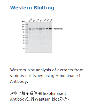 己糖激酶I抗体识别内源性的己糖激酶I总蛋白水平。该多克隆抗体用与人类己糖激酶I氨基酸序列对应的人工合成肽段免疫动物制成。该抗体使用蛋白A和肽亲和层析纯化制得。己糖激酶催化糖酵解第一步中葡萄糖到6-磷酸葡萄糖的转化(1)。目前已确定哺乳动物己糖激酶的四个不同的亚型,分别为I, II, III, IV(葡萄糖激酶)。己糖激酶I、II、III与线粒体外膜相关联,在癌细胞保持高效率无氧酵解(Warburg效应)中至关重要(1),这补偿了快速生长增殖的癌细胞的能量需求(2,3)。