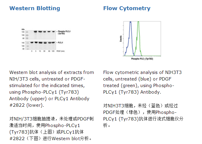 Phospho-PLCγ1 (Tyr783) Antibody detects PLCγ1 only when phosphorylated at tyrosine 783. It does not cross-react with phosphorylated PLCγ2 or other PLCs.