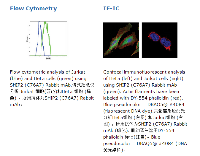SHIP2 (C76A7) Rabbit mAb 能够检测内源SHIP2蛋白总体水平。单克隆抗体是通过合成人源对应的SHIP2 Ala1083位点周围的肽段来免疫动物而获得。包含SH2的肌糖磷酸酶1(SHIP1)是造血组织中的磷酸酶,水解磷脂酰肌醇-3,4,5-三磷酸盐成磷脂酰肌醇-3,4-二磷酸盐(1)。SHIP1是细胞质磷酸酶在其N-末端有SH2区域 和C-末端的两个NPXY Shc结合区域(1,2)。受体交叉结合后, SHIP首先被招募到膜结合处,通过其SH2区域结合到ITIM域的磷酸化酪氨酸上(2),这在酪氨酸磷酸化NPXY域之后(2)。细胞膜的重新定位和NPXY域的磷酸化对SHIP1的调控功能非常重要(3-5)。它通过PI3K和Akt通路影响钙流,细胞的存活,生长,细胞周期和凋亡(3-5)。Tyr1021定位于SHIP1的一个NPXY域内, 而且其磷酸化对SHIP1功能是非常重要的(6)。SHIP2是SHIP1的同源基因,在心脏,骨骼肌,胎盘中高表达(7)。SHIP2负调控胰岛素信号(8) ,SHIP2的多态性与高血糖症有关(9)。最近的研究也表明SHIP2作为肥胖症和2型糖尿病的治疗靶标(10,11)。