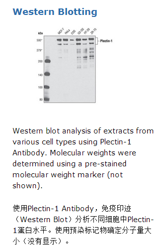 Plectin-1 Antibody识别内源性plectin-1总蛋白。该抗体被期望与plectin-1蛋白所有亚型发生交叉反应,这是基于产生免疫原性多肽的序列。通过人工合成人源plectin-1蛋白中间序列相应的多肽片段去免疫动物从而制备出多克隆抗体。Plectin蛋白是一个广泛表达的蛋白,该蛋白与中间丝和肌动蛋白细胞骨架、机械稳定的细胞和组织有交联。Plectin蛋白也在调节肌动蛋白动力中起着一定作用,并且该蛋白用作信号分子的支架蛋白(1)。Plectin蛋白在半桥粒的稳定性有着重要作用,并且交联它们到中间丝的网架中。在plectin基因和其它编码半桥粒蛋白的基因中的突变能引起大疱性表皮松解症,该病体现在脆性皮肤和频繁的发热(1,2)。研究已经显示Plectin蛋白涉及数个信号传导通路。通过结合和隔绝RACK1激酶、activated C kinase 1 受体,它能传递信号到PKC激酶(3,4)。Plectin蛋白也涉及角蛋白架构和细胞应激反应(5)的调节、通过趋化因子受体CXCR4蛋白信号的传递(5)、AMP-activated protein kinase (AMPK)活性的调节和小鼠肌管的信号传递(6)。