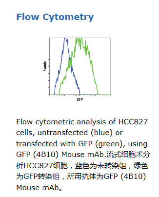 GFP (4B10) Mouse mAb detects GFP-tagged proteins exogenously expressed in cells. Please note that the GFP tag adds approximately 27 kDa to the molecular weight of the fusion protein.
