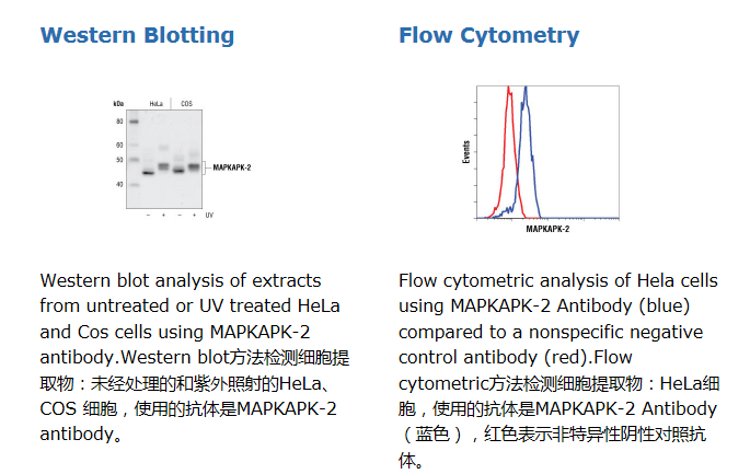 MAPKAPK-2 Antibody detects endogenous levels of total MAPKAPK-2 protein. This antibody does not cross-react with MAPKAPK-3 or -5.