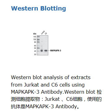 MAPKAPK-3 Antibody 兔单抗能检测内源性总MAPKAPK-3 蛋白水平。该抗体不能与MAPKAPK-2、MAPKAPK-5蛋白发生交叉反应。多克隆抗体是通过用与人源MAPKAPK-3蛋白胺端区域相一致的合成肽段免疫动物后获得的。该抗体经蛋白A和肽亲和层析纯化。MAPKAPK-3的脯氨酸富集胺端有一个潜在SH3结合位点,以及一个推测的ATP结合位点、两个MAP激酶磷酸化位点基序和一个推测的细胞核定位信号。它在核苷酸水平与MAPKAPK-2有72%的相似率,在氨基酸水平与MAPKAPK-2有75%的相似率(1)。已经证明MAPKAPK-3能被细胞中的生长诱导因子和应激刺激而活化。体内研究证明Erk, p38 MAP激酶和Jun胺端激酶能磷酸化并活化MAPKAPK-3,暗示了在有丝分裂原和应激应答中该激酶是信号传导的重要结点(2)。有报道称MAPKAPK-3与E47的磷酸化和活性抑制有关,E47是一个“碱性螺旋-环-螺旋” 转录因子,涉及到组织特异性基因表达和细胞分化的调节(3)。通过细胞核转录因子CREB的磷酸化和活化,MAPKAPK-3也许能有助黄体的成熟 (4)。