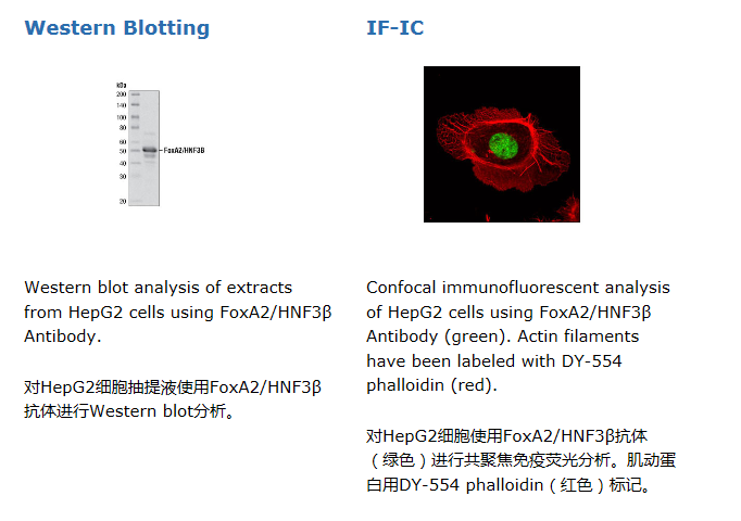 FoxA2/HNF3β抗体识别内源性的FoxA2/HNF3β总蛋白水平。该多克隆抗体用与人类FoxA2/HNF3β氨基酸序列对应的人工合成肽段免疫动物而制成。该抗体使用蛋白A和肽亲和层析纯化而得。叉头框(Forkhead box)蛋白A2(FoxA2,也被称作肝细胞核因子3β或HNF3β)是一个转录因子,在肝细胞功能中扮演重要角色(1)。FoxA2/HNF3β是空腹时肝生糖基因表达所必需的(1)。与协同因子PGC-1β一起,FoxA2/HNF3β可以刺激脂肪酸β氧化相关基因的表达,增强脂肪酸的代谢(2)。FoxA2/HNF3β,与PGC-1β一起,可以激活微粒体甘油三酯转运蛋白(MTP)的表达,促进VLDL分泌(2)。另外,除了其在代谢综合症中发挥的作用,FoxA2/HNF3β也对小鼠胚胎内胚层和中线结构的发育至关重要(3-5)。