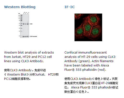 CLK3 Antibody检测内源性CLK3蛋白的全长和截短形式额水平。通过人工合成CLK3蛋白His51位点周围序列相应的多肽片段去免疫动物从而制备抗体。 通过蛋白A和多肽亲和层析纯化抗体。cdc2-like kinase (CLK)家族至少包含四种高度保守的异构体: CLK1、CLK2、CLK3和CLK4 (1,2)。CLKs蛋白家族是双特异性蛋白激酶,即能在丝氨酸、苏氨酸和酪氨酸位点发生自磷酸化,又能使外源性蛋白的丝氨酸和苏氨酸位点发生磷酸化(2)。CLK家族成员以具有催化活性的全长形式和无活性的选择性剪切的截短形式存在(1)。CLKs蛋白家族可磷酸化一类高度磷酸化的蛋白,这类蛋白称为丝氨酸和精氨酸富集(SR)蛋白(3-5)。SR蛋白是一类剪接因子,调节剪接体的装配。而细胞核内RNA剪切过程发生在剪接体中。SR蛋白也涉及到剪接位点的选择。因此,CLKs可能在RNA剪接的调节中起到重要作用。