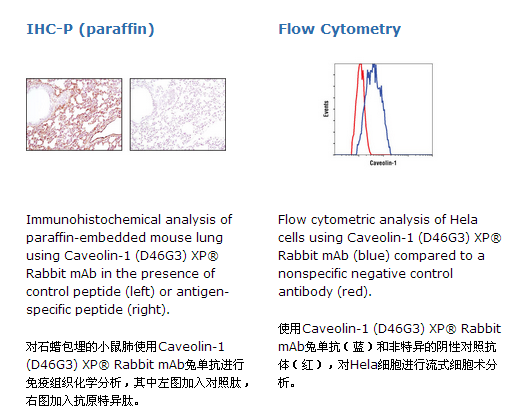 Caveolin-1 (D46G3) XP® Rabbit mAb兔单抗识别内源性的caveolin-1总蛋白。该单克隆抗体用与人类caveolin-1蛋白中Glu20位点附近的氨基酸序列对应的人工合成肽段免疫动物而制成。21-24kDa的整合蛋白,caveolins,是胆固醇/神经鞘脂富集的细胞膜微区域小窝的核心结构。caveolin家族的三个成员(caveolin-1,-2,-3)已经识别出来,它们在不同组织中分布不同。Caveolin形成异源和同源寡聚体,与胆固醇和其它脂质相互作用(1)。Caveolin参与多种生物功能,包括囊泡转运、胆固醇稳态、细胞黏附、凋亡,在神经退行性疾病中也有作用(2)。Caveolin也与多种信号分子相互作用,如Gα亚基、酪氨酸激酶受体、PKCs、Scr家族酪氨酸激酶和eNOS(1,2)。目前认为Caveolin是一个整合信号传导的脚手架蛋白。其Tyr14的磷酸化对其与包含SH2或PTB结构域的接头蛋白如GRB7的结合至关重要(3-5)。Ser80的磷酸化调节caveolin结合到内质网膜并进入分泌途径(6)。