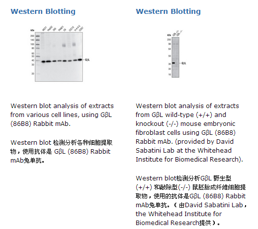 GβL (86B8) Rabbit mAb 兔单抗能够检测内源性的GβL总蛋白。GβL (86B8) Rabbit mAb 兔单抗是采用人类GβL蛋白Gln210周围残基相对应的合成肽段免疫动物生产的。细胞生长是一个细胞增加物质扩大体积的基本生物学过程。哺乳动物雷帕霉素靶点(mTOR)通路和生长因子驱动的信号一起协调能量和营养信号,调节生长(1)。mTOR是一个大的具有两种形式复合物的蛋白激酶。一个复合物包含mTOR,GβL和raptor,是雷帕霉素的靶点。另一个复合物,对雷帕霉素不敏感,包括mTOR,GβL,和rictor(1)。GβL与mTOR激酶结构域结合并激活mTOR激酶活性(2)。人们已证明GβL表达减少可以减少S6K1体内磷酸化水平(2)。
