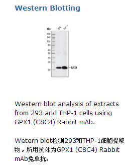 GPX1 (C8C4) Rabbit mAb用于检测内源性GPX1总蛋白水平。单克隆抗体通过用对应于人源GPX1蛋白序列的合成肽免疫动物制备而得。谷胱苷肽过氧化物酶1(GPX1)是一种位于细胞质的含硒蛋白,它可以将过氧化氢还原为水(1)。GPX1是已发现的五种同工酶中最广泛最普通的酶(2)。 它是细胞抗氧化的主要组分,该蛋白与多种疾病有关,如结肠癌(3),冠心病(4)和胰岛素抵抗(1)。