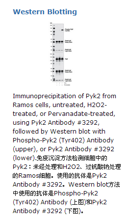 Phospho-Pyk2 (Tyr402) Antibody兔多抗能检测内源性Tyr402位点磷酸化的Pyk2蛋白水平。该抗体可能与其他含有磷酸化酪氨酸的蛋白发生交叉反应。该多克隆抗体是采用合成的与人源 Pyk2蛋白Tyr402位点周围残基相一致的磷酸化肽段免疫动物而获得。该抗体经蛋白A和肽亲和层析纯化。蛋白酪氨酸激酶Pyk2, 也被称为CAKβ, RAFTK和CADTK,是一种非受体酪氨酸激酶,在结构上与粘着斑激酶(FAK)相关(1-4)。Pyk2主要表达于来源于造血细胞系的细胞中和中枢神经系统中。Pyk2是G蛋白偶联受体和MAPK信号转导途径的一个信号转导调节子。它在细胞伸展和迁移过程中起着重要的作用(5-7)。TCR的结合能够使Pyk2的酪氨酸磷酸化,从而被激活(8,9)。Pyk2蛋白Tyr402位点的磷酸化是Pyk2蛋白中其他酪氨酸的磷酸化所必须的,并且在T细胞活化过程中为Fyn SH2提供结合位点(10)。