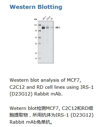 IRS-1 (D23G12) Rabbit mAb用于检测内源性IRS-1总蛋白水平。该抗体不与IRS-2交叉反应。单克隆抗体通过用对应于人源IRS-1蛋白Ser270位点序列的合成肽免疫动物制备而得胰岛素受体底物1(IRS-1)是胰岛素受体激酶的一类主要底物(1)。 IRS-1包含多个酪氨酸磷酸化位点,可以作为含SH2结构域蛋白的停靠位点,这些蛋白调控着胰岛素的代谢和促生长功能(2-4) 。IRS-1还包含着起过30个潜在的丝氨酸/苏氨酸磷酸化位点,307位丝氨酸可以被JNK(5)和IKK(6)磷酸化,789位的丝氨酸可以被SIK-2(是AMPK家族成员)磷酸化(7)。PKC和mTOR途径可以分别磷酸化IRS-1的612位丝氨酸和636/639位丝氨酸(8,9)。PKCθ可以介导IRS-2在1101位丝氨酸位的磷酸化,此位点的磷酸化会导致细胞胰岛素信号通路的抑制,因此它可能在某些肥胖模型的胰岛素抵抗中起着某些作用(10)。