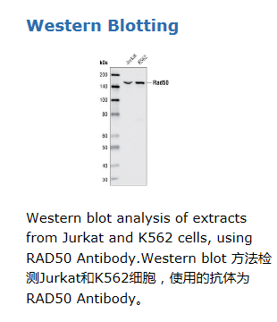 Polyclonal antibodies are produced by immunizing animals with a synthetic peptide corresponding to the amino terminus of human Rad50. Antibodies are purified by protein A and peptide affinity chromatography.