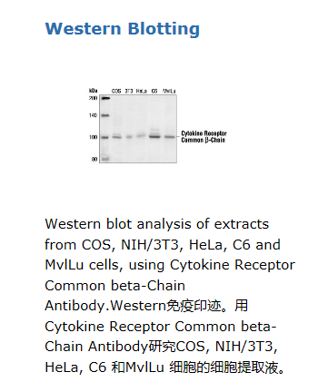 Cytokine Receptor Common beta-Chain Antibody detects endogenous levels of total cytokine receptor common beta-chain protein independent of phosphorylation.