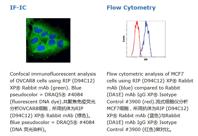 RIP (D94C12) XP® Rabbit mAb detects endogenous levels of total RIP (RIP1) protein. It has not been shown to cross-react with other RIP family members.