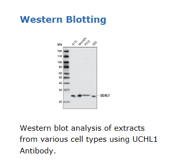 此抗体是通过合成与人UCHL1蛋白Asp110邻近氨基酸残基序列一致的肽段,免疫动物获得,抗体经肽亲和层析纯化。 Western blot analysis of extracts from various cell types using UCHL1 Antibody. 使用UCHL1抗体对不同类型细胞提取物该蛋白进行检测的免疫印迹分析结果。