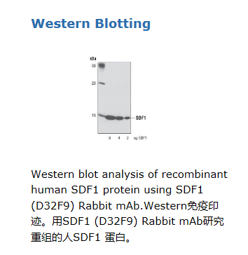 SDF1 (D32F9) Rabbit mAb detects recombinant SDF1 protein.