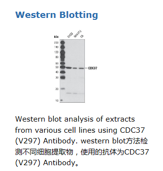 CDC37 (V297) Antibody 能够检测内源性CDC37总蛋白。该多克隆抗体是由合成的人源的针对CDC37蛋白V297肽段免疫动物,利用A蛋白和多肽亲和层析方法纯化生产的。CDC37是HSP90伴侣复合体的重要组成部分(1-3)。CDC37蛋白含有一个氨基末端激酶结合结构域紧随中央的HSP90结合结构域。它能够阻止新合成的激酶肽链被降解并促进蛋白成熟的下一个步骤从而招募和稳定HSP90复合体中的激酶(4,5)。CDC37也抑制HSP90的ATP酶活性,从而导致复合体的构象变化阻止靶激酶的进入(6)。由于CDC37在多激酶通路中的重要作用如增殖和肿瘤细胞存活包括Raf, Akt, Src和ErbB2通路(7,8),它一直被认为是重要的治疗靶点。