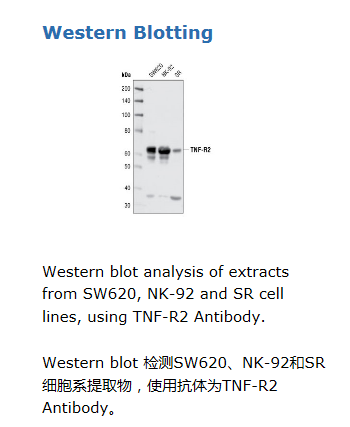 TNF-R2 Antibody 能够检测内源TNF-R2总蛋白。该多克隆抗体是由合成的人源TNF-R2蛋白胞内区Asp335处相应的肽段免疫动物而制备的。抗体由protein A和肽亲和层析技术纯化。TNF-α是一个重要的细胞因子,它由很多种细胞产生,包括中性粒细胞、激活的淋巴细胞、巨噬细胞和NK细胞。它在炎症反应和凋亡过程中发挥重要的作用(1)。TNF-α 存在细胞膜锚定和可溶性形式,这两种形式都有生物活性。 两个受体介导对TNF-α的响应,一个是广泛表达的TNF-R1,另一个是主要在免疫和内皮细胞表达的TNF-R2(2)。 TNF-α的拮抗剂已经被证实是风湿性关节炎和免疫紊乱的治疗靶标(3)。TNF-α的两个受体, TNF-R1 (55 kDa) 和 TNF-R2 (75 kDa), 能够介导不同的细胞应答(4,5)。据报道,很多时候TNF引导的细胞毒性是通过TNF-R1(6,7)。与此相反,TNF-R2对于T细胞信号通路和感染应答十分重要(7,8)。 TNF-R2结合TRAF家族的不同成员导致NF-κB的激活(9,10)。这两个可溶性的受体都已经被鉴定,他们能够结合TNF-α,并在免疫紊乱过程中发挥了重要的作用(11,12)。