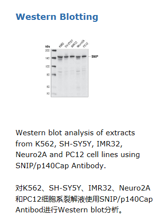 Polyclonal antibodies are produced by immunizing animals with a synthetic peptide corresponding to residues near the carboxy terminus of human SNIP/p140Cap. Antibodies were purified by protein A and peptide affinity chromatography.