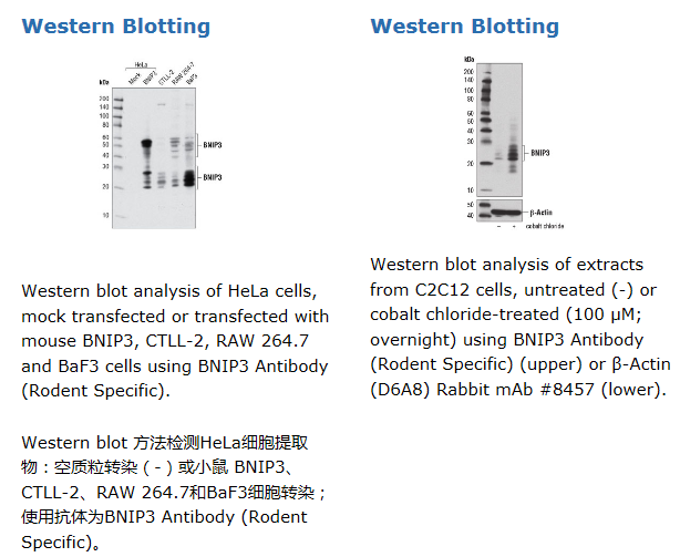 BNIP3 Antibody (Rodent Specific) 能够检测内源性的小鼠和大鼠的BNIP3总蛋白。该多克隆抗体是由合成的小鼠/大鼠源BNIP3蛋白 Ser60位周围残基相对应的肽段免疫动物而制备的。抗体由protein A和肽亲和层析技术纯化。BNIP3(Bcl-2/E1B-19kDa互作蛋白3)是一种促凋亡线粒体蛋白,是Bcl-2家族成员之一,包含一个Bcl-2同源3(BH3)结构域和羧基末端跨膜(TM)域(1-3)。预测BNIP3分子量约22kDa ,然而在SDS-PAGE的结果中还出现了一个约60 kDa的条带,这可能是其尚未分解的二聚体(2)。BNIP3与抗凋亡的Bcl-2家族成员Bcl-xL和腺病毒同源物E1B-19kDa协同作用。不同于其他只含有BH3结构域的Bcl-2家族成员, BNIP3还有一个TM域,TM域对于其线粒体定位和促凋亡活性是必需的,而不是BH3结构域(4)。除了细胞凋亡,BNIP3还与坏死(5)和自噬(6,7)相关,但是BNIP3和这些过程之间的关系尚不完全清楚。在缺氧条件下,BNIP3表达增加,这主要受转录因子HIF-1α的调控(8-10)。人们已经在几种类型的癌症细胞中,观察到BNIP3启动子的甲基化沉默,这可能在它们的生存中可能起着重要的作用(11-14)。