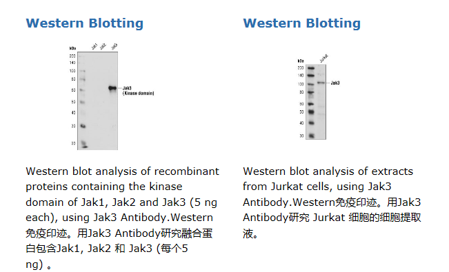 Jak3 Antibody detects endogenous levels of total Jak3 protein. No cross-reactivity was detected with other family members at physiological conditions.