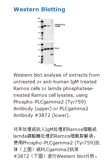 Phospho-PLCgamma2 (Tyr759) Antibody detects endogenous levels of PLCgamma2 only when phosphorylated at tyrosine 759. The antibody does not cross-react with phosphorylated PLCgamma1.
