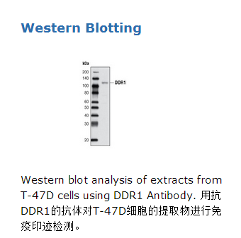 DDR1 Antibody detects endogenous levels of total DDR1 protein. The antibody does not cross-react with other proteins of the DDR family.