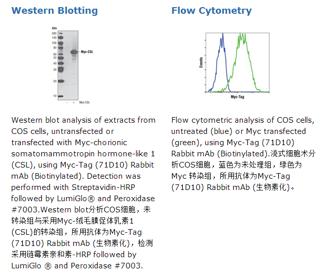 This Cell Signaling Technology (CST) antibody is conjugated to biotin under optimal conditions and tested using COS cells transfected with Myc tagged protein.