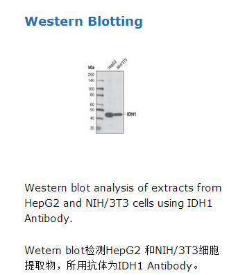 IDH1 Antibody detects endogenous levels of total IDH1 protein. The antibody does not cross react with IDH2.