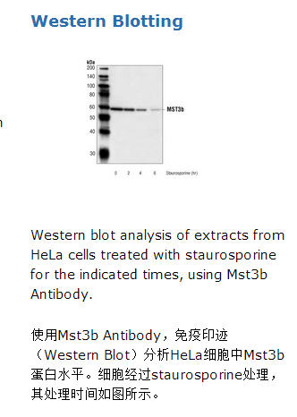 Mst3b Antibody 能够检测内源性的Mst3b总蛋白。该抗体不能与Mst3、Mst1、Mst2或Mst4蛋白发生交叉反应。通过人工合成人源Mst3b蛋白氨基末端相应的肽段去免疫动物从而制备出多克隆抗体。通过蛋白A和多肽亲和层析纯化抗体。Mst激酶是激酶STE20家族成员,该蛋白是MAPK通路的上游激活因子,调节相关进程例如凋亡、形态形成和细胞骨架重排。研究表明,Mst蛋白的氨基端激酶区域与酵母STE20激酶的激酶结构域及其它p21激活的激酶具有同源性(1)。Mst1和Mst2蛋白的羧基末端区域包含二聚化和抑制区域(1-3)。激活环的二聚化和磷酸化能够导致Mst1蛋白从细胞质迁移到细胞核(3)。不断的研究指出,Mst1、Mst2和Mst3蛋白在凋亡信号和其它应激条件下被激活(4-6)。Mst1蛋白的完全激活需要磷酸化和caspase介导的剪切(4)。GCK家族的激活环的序列比对认为 Mst1 蛋白Thr183位点和 Mst2 蛋白Thr180位点是保守的残基,并且可能对该激酶的活性起着重要作用。活化的 Mst 激酶可能依赖于p38 MAPK和JNK通路去扩大凋亡信号(5)。Mst1蛋白的Ser327位点距离caspase-3识别位点很近,该位点的磷酸化抑制caspase介导的剪切 (4)。Mst3b蛋白是Mst3蛋白的亚型,据报道该蛋白是通过PKA激酶调节(7)。