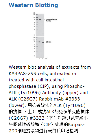 磷酸化ALK(Tyr1096)抗体仅在(Tyr1096)(对应NPM-ALK上156)被磷酸化后才能检测到ALK的存在。本抗体也能与其它过表达的磷酸化酪氨酸激酶交叉反应。Antibodies are purified by protein A and peptide affinity chromatography 多克隆抗体通过用合成磷酸化多肽免疫动物得到,该多肽是根据人的ALK蛋白Tyr1096附近的氨基酸序列合成的。抗体经过protein A和亲肽亲和层析纯化。间变性淋巴瘤激酶(ALK)是多效生长因子(PTN)的酪氨酸激酶受体,它是大脑胚胎发育过程中的生长因子(1-3)。 在表达ALK的细胞中,PTN诱导ALK及其下游效应因子IRS-1, Shc, PLCγ, 和PI3K激酶发生磷酸化(1)。ALK最初是从易位突变产生的NPM-ALK融合蛋白而被发现的(4)。NPM-ALK融合蛋白是一个组成性活化,有原癌基因活性的间变性淋巴瘤相关酪氨酸激酶(4)。 由NPM-ALK介导的PLCγ的活化可能对有丝分裂活性起到关键作用,并且可能对间变性淋巴瘤的发病过程很重要(5)。另一个完全不同的ALK原癌融合蛋白在非小细胞肺癌细胞株中被报道,该蛋白融合了ALK与EML4,其相应融合转录产物在一些肺腺癌中也有表达。在EML4-ALK融合蛋白中,微管相关蛋白EML4的短氨基末端区域和ALK的激酶活性区域融合在一起(6,7)。ALK的Tyr1096位点磷酸化是Cell Signaling Technology (CST)公司L利用C-MS/MS平台PhosphoScan®技术在寻找磷酸化位点过程中发现的。NPM-ALK的Tyr1096位点磷酸化也被其他实验室报道在某些肿瘤及肿瘤细胞系中存在,并对NPM-ALK 的功能十分重要(8,9)。