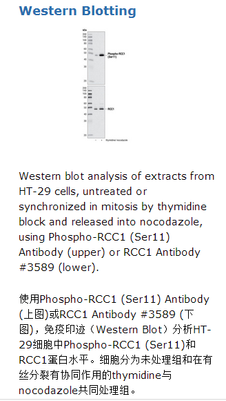 Phospho-RCC1 (Ser11) Antibody recognizes endogenous levels of RCC1 protein only when phosphorylated at Ser11.