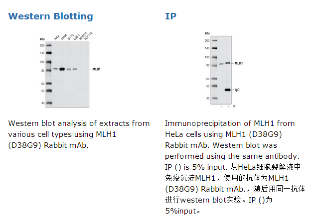 MLH1 (D38G9) Rabbit mAb能够检测内源性MLH1总蛋白。该单克隆抗体是由合成的人源的针对MLH1蛋白氨基末端的肽段免疫动物生产的。错配修复(MMR),一种涉及DNA合成过程中错误纠正的保守过程,对于维持基因组的完整性至关重要。MLH1是大肠杆菌MMR基因突变体的人类同源蛋白。MMR识别碱基错配或者插入/缺失回路需要MutL异源二聚体复合物招募而来的MutS同系物,该复合体由MLH1 和PMS1 (MutL-α), PMS2 (MutL-β)或者MLH3 (MutL-γ)组成。其它影响真核细胞中MMR的因子有EXO1, PCNA, RFC, RPA, DNA 聚合酶和DNA连接酶(回顾1)。MLH1基因失活可以引起基因组不稳定性和肿瘤易感性(2-5)。遗传性非息肉型结肠癌(HNPCC)中MLH1基因突变频繁(6)。MLH1也在减数分裂重组中起重要作用(7)。
