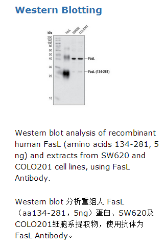 FasL Antibody 能够检测内源性水平FasL总蛋白。预期该抗体也能够与膜或可溶性形式的FasL蛋白反应。未检测到其与他家庭成员的交叉反应。该多克隆抗体是采用合成的人源Fas蛋白脯氨酸(134位)周围残基相对应的肽段免疫动物而制备的。抗体由protein A和肽亲和层析技术纯化。受体Fas及其配体FasL的结合会触发细胞凋亡通路,这在免疫调节、发育和癌症进程中起着重要作用(1,2)。无论是Fas( lpr小鼠)还是FasL(gld小鼠)的功能突变缺失都会导致淋巴结肿大和脾肿大,并减弱CD4-CD8-T淋巴细胞的细胞凋亡(3,4)。FasL (CD95L, Apo-1L)是II型跨膜蛋白,有280个氨基酸(糖基化后电泳条带约40 kDa),属于TNF家族,该家族还包括TNF-α,TRAIL和TWEAK。FasL蛋白与其受体结合,触发形成死亡诱导信号复合物(DISC),同时募集接头蛋白FADD和caspase-8(5)。在这个复合物中caspase-8的激活会引发半胱天冬酶级联反应,从而引起caspase-3的活化和随后的蛋白质裂解,最后导致细胞凋亡。与Fas不同,其在各种类型细胞中都会组成型表达,FasL主要在活化的T淋巴细胞、NK细胞和免疫优先位点表达(6)。FasL也作为一种逃避免疫监视的机制在几种不同类型的肿瘤中表达(7)。与TNF家族的其他成员类似, FasL可以被金属蛋白酶裂解产生可溶形式的26 kDa的三聚体(8,9)。