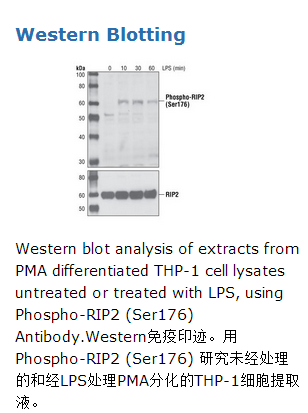 Receptor Interacting Protein 2 (RIP2) is a serine/threonine kinase with a carboxy-terminal caspase activation and recruitment domain (CARD). Association of RIP2 with the tumor necrosis factor receptor (TNFR) causes activation of NF-kB and induction of apoptosis (1-3). Expression of RIP2 is induced in macrophages upon exposure to bacterial cell wall components such as LPS. RIP2-deficient mouse models demonstrate that this kinase integrates and transduces signals for both the innate and adaptive immune system (4,5).Serine 176 is a regulatory autophosphorylation site and can be used to monitor the activation state of RIP2 (6).