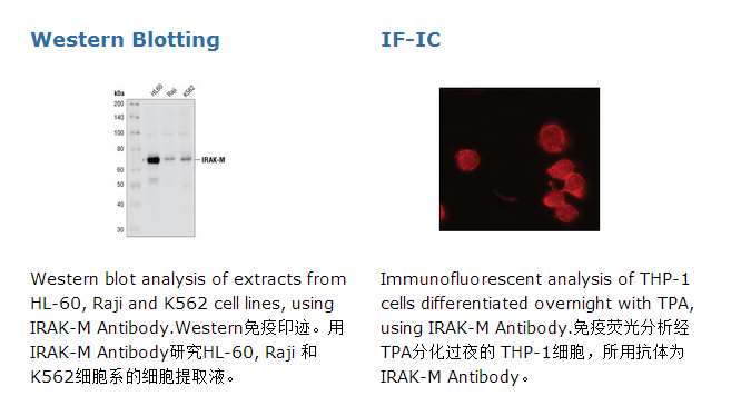 IRAK-M antibody detects endogenous levels of total IRAK-M protein. Cross reactivity was not detected with other family members.