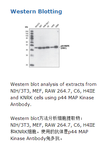 p44 MAP Kinase (Erk1) Antibody detects endogenous levels of p44 MAP kinase (Erk1). This antibody does not recognize p38 MAP kinase, p42 MAP kinase (Erk2) or SAPK/JNK.
