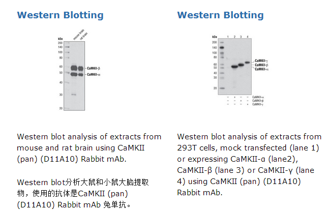 CaMKII (pan) (D11A10)Rabbit mAb 兔单抗识别内源性的总CaMKII蛋白。用来制作抗原的肽段序列与CaMKII-α,-γ 或者 -δ 100%保守,与CaMKII-β 88%保守。该单克隆抗体由合成的人类CaMKII-α中Val184位点附近肽段免疫动物而制成。CaMKII的是一种钙/钙调素活化蛋白激酶家族的重要成员,在神经突触的刺激和T细胞受体信号通路中起作用(1,2)。CaMKII具有催化和调节功能域。与Ca2+/钙调蛋白调节功能域的结合,可以产生自身抑制效果,并激活激酶(3)。活化的CaMKII进一步在Thr286自身磷酸化,呈现出其具有的激酶活性(3)。CaMKII的苏氨酸磷酸化状态,可通过PP1/PKA调节。PP1(蛋白磷酸酶1)可以对磷酸化的CaMKII在Thr286进行去磷酸化。PKA(蛋白激酶A)通过对PP1的抑制作用防止这种去磷酸化(4)。