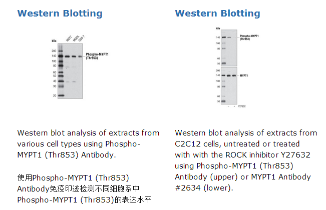 Polyclonal antibodies are produced by immunizing animals with a synthetic phosphopeptide corresponding to residues surrounding Thr853 of human MYPT1. Antibodies are purified using protein A and peptide affinity chromatography.