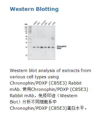 Chronophin/PDXP (C85E3) Rabbit mAb检测内源性chronophin/PDXP总蛋白。使用重组的小鼠MBP-chronophin蛋白免疫动物从而制备出单克隆抗体。Cofilin蛋白是一个保守的剪切类肌动蛋白结合蛋白(actin-severing protein),对于依赖actin动力的生理过程需要Cofilin蛋白,包括胞质分裂和细胞迁移(1)。actin动力的调节需要在cofilin蛋白的磷酸化形式和非磷酸化形式之间控制循环 (2)。通过 LIMK或TESK激酶使cofilin蛋白保守的氨基末端 Ser3位点磷酸化,cofilin蛋白剪切活性被抑制(3,4)。Slingshot (SSH)磷脂酶有三个哺乳类亚型被鉴定,其在体内可以使cofilin蛋白去磷酸化(5)。Chronophin (CIN, PDXP)是一个haloacid dehalogenase磷酸酶,其也可使cofilin蛋白去磷酸化。通过野生型或磷酸酶失活的突变CIN蛋白的过表达,CIN活性的改变干扰actin动力、细胞形态和细胞分裂 (6)。